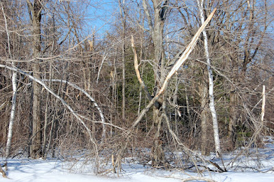 That's when I began to notice that all the trees were looking pretty scraggly. Most of them were now topped with jagged splinters, and everywhere the understory was littered with huge broken branches. The winter's ice storms have really taken a toll on the forest out this way.